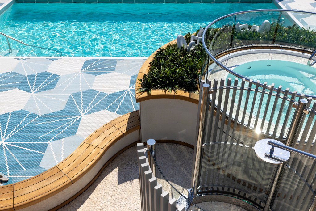 It’s beautifully done—quiet, understated, and blissfully uncrowded. Two whirlpools, a hydrotherapy pool with thoughtfully designed jets, and plenty of space to simply be. On one port day, I had the entire area to myself for nearly an hour, which felt like an extraordinary luxury on a ship of this size.